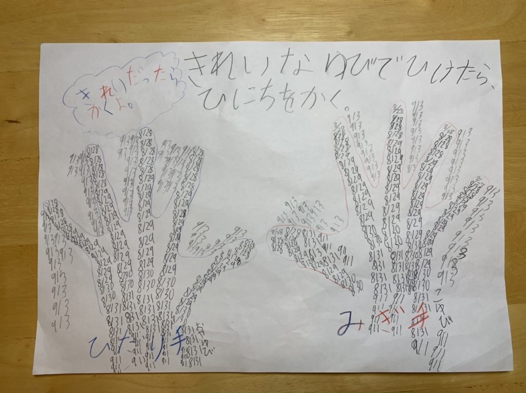 しかし、とても地道な練習で、ただ単に「おうちで1つの音を、きれいな指の形で弾いてきてね。」と言っても、楽しくありません💦。そこで、紙に自分で手形👐を描いてもらい、きれいに弾けたら日付を書く、という宿題を先週出しました。すると…