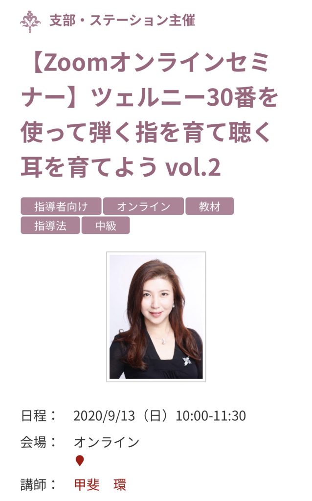 昨日、ピティナピアノセミナー「Zoomオンラインセミナー」ツェルニー30番の第2回目に参加しました。講師は、各種コンクールにおいて上位入賞者を多数輩出、また審査経験が豊富な甲斐環先生です。