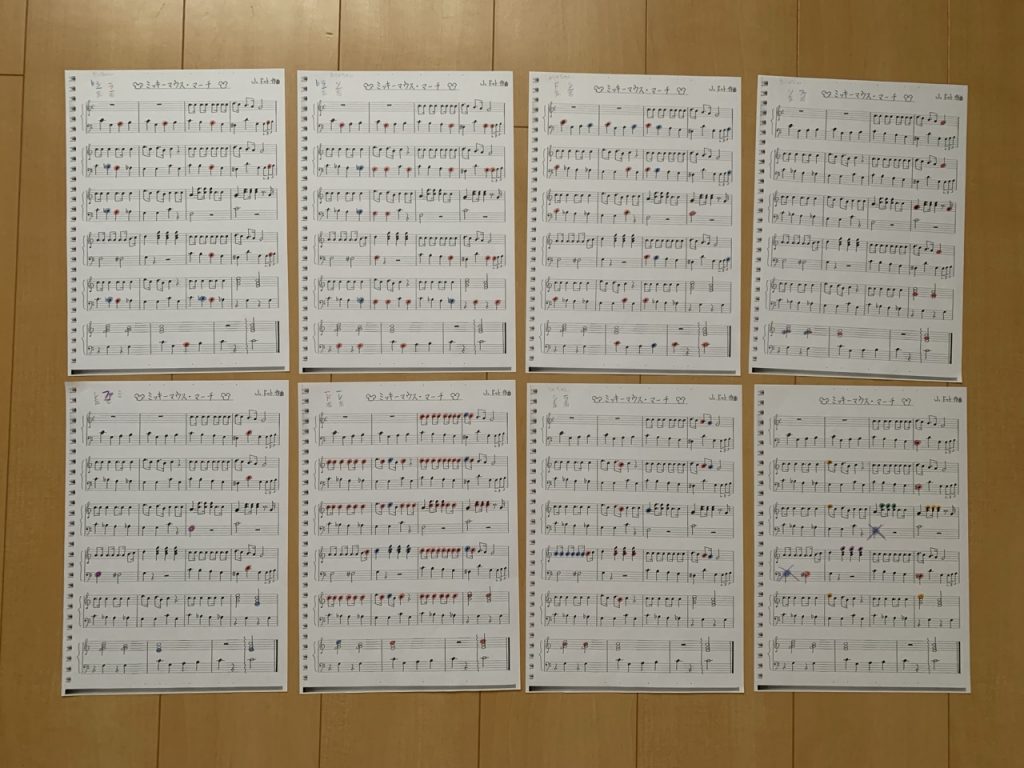ハンドベル用に新しく楽譜を書きました。一人ひとりに音を振り分けて、左右のベルを色分けしました。家で練習できるように音源(ピアノ演奏)を録音して送りました。