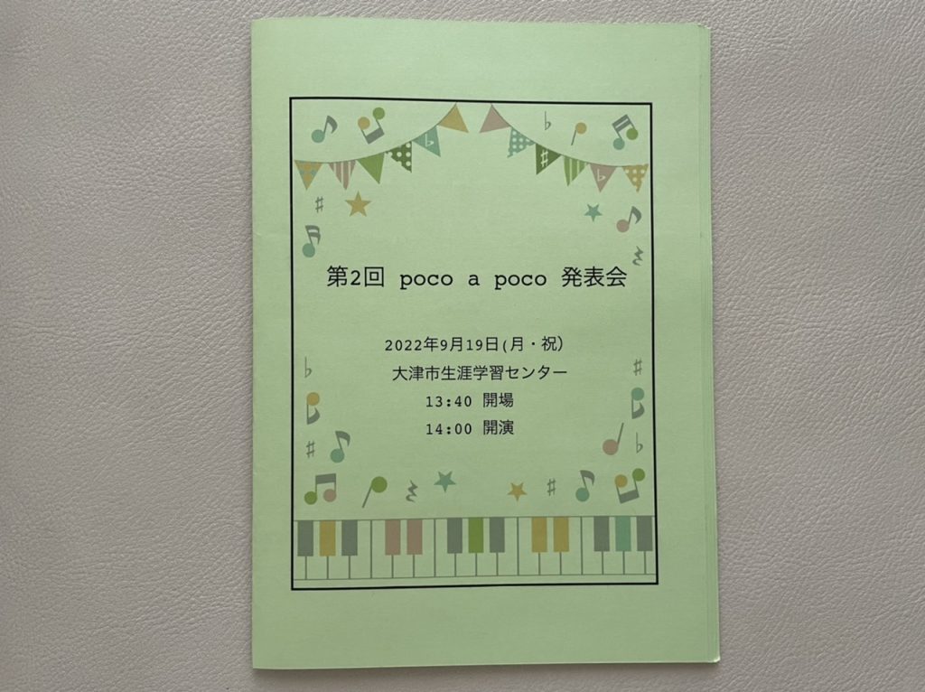 9月19(祝)、大津市生涯学習センターで、🎹第2回 poco a poco発表会🎊を開催しました。去年と同様に感染予防対策をしながら、今年は台風の影響もあり、開催の判断が難しかったです。最後まで何とか天気は持ち、一安心しました。
